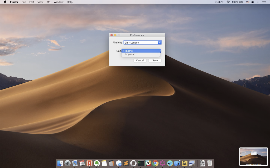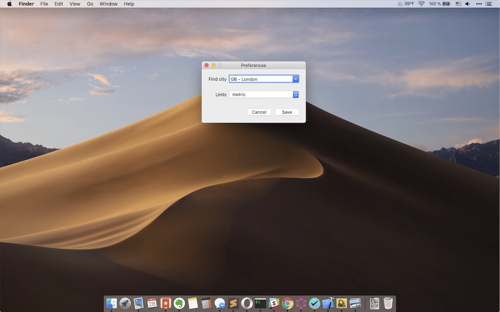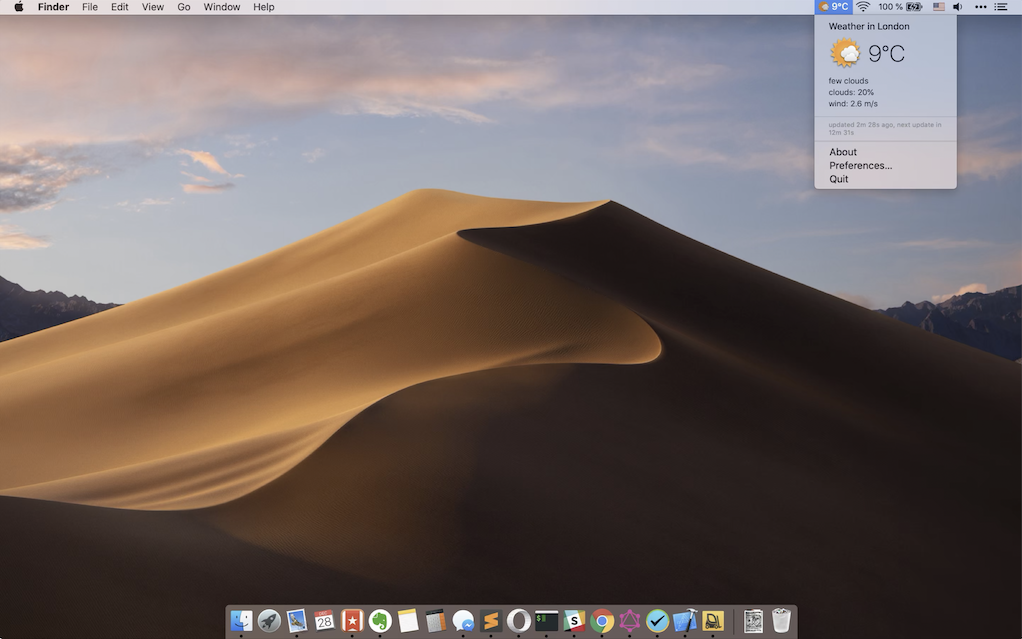 "Weather for Status Bar" is a simple desktop app for MacOS. It displays the current weather situation on the status bar and more detail info on click on its icon in the popup.